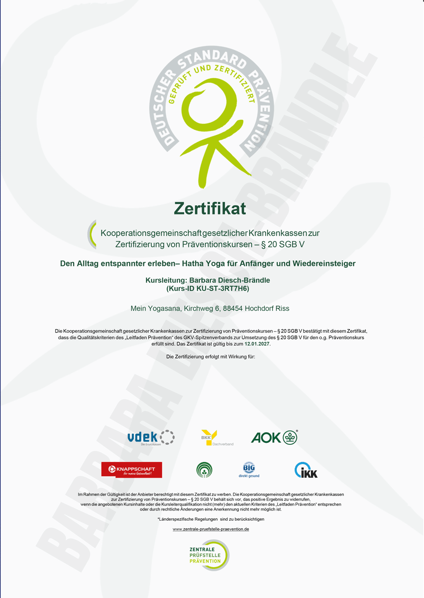 seit 2020 von der Zentralen Prüfstelle für Präventionsmaßnahmen (ZPP) nach § 20 Sozialgesetzbuch V zur Leitung zertifizierter Präventionskurse zugelassen